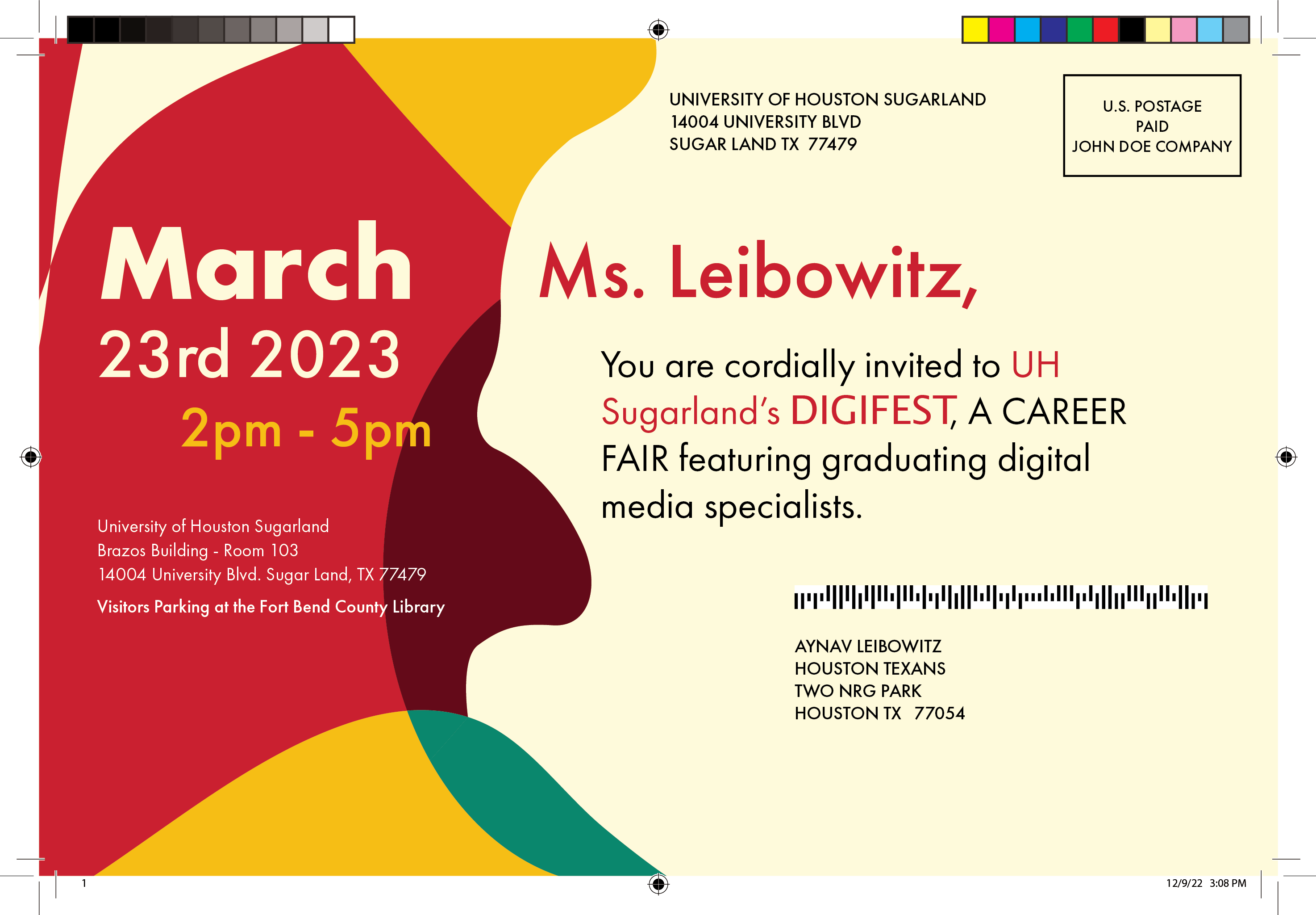 Our group in DIGM 3351: Individualized Comm. Processes used XMPie to create a Variable Data Printing (VDP) campaign that either shows the job listing or hides it if there’s no openings. In addition, we changed the name, address, and images based on the industry of the business. Put together, this campaign created a highly individualized experience for recipients of the invitations.
